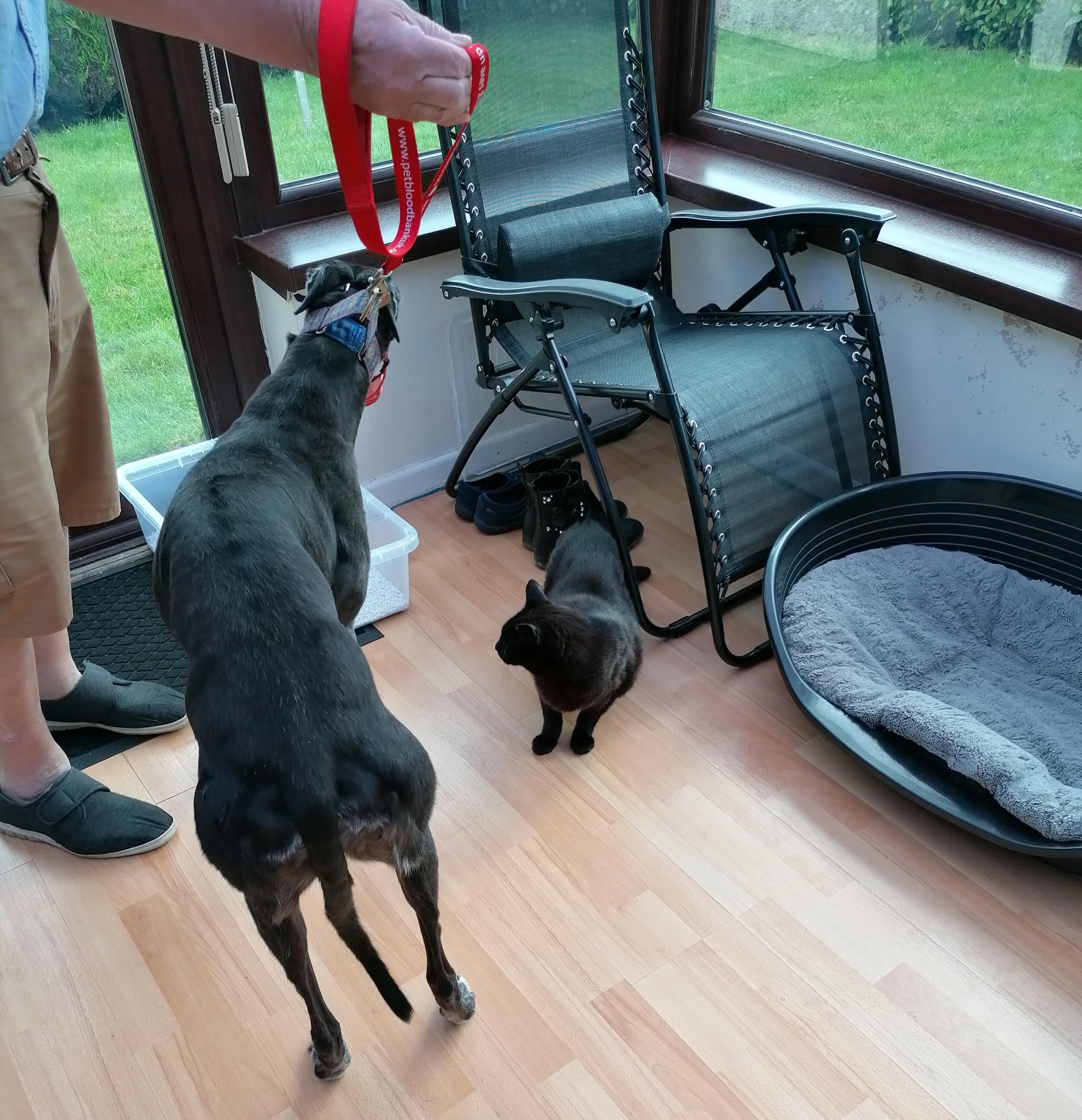 This afternoon we took Bonnie to see Diana’s cat to see how she reacted to it. She had her muzzle on, she was on a short lead and Stuart had the water spray ready, but Bonnie wasn’t the least bit interested in it even when Stuart tried turning her head towards it as it walked across the floor. A definate cat test pass, so Bonnie will be off to a new home soon to live with a retired lady and her cat.