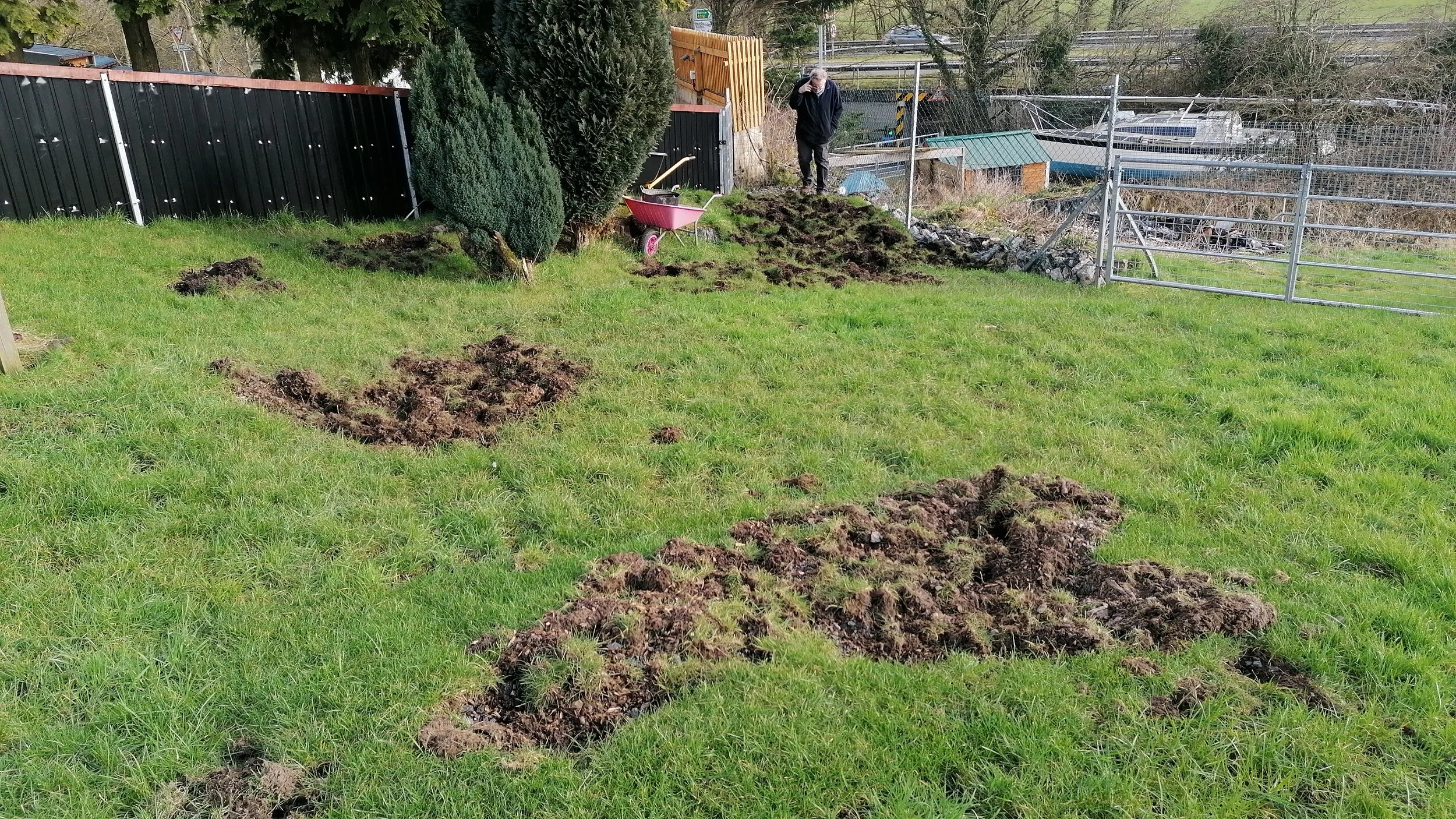 We had a badger visit the paddock last night, and oh dear what a mess it’s made. It ripped a hole in the chain link fence where it connects to the double gates and has dug up everywhere Charles has levelled off and put new turf during last year. Charles spent a lot of time last year levelling the paddock and laying new turf to make it safe for the dogs to run in. We were very proud of all he’s done so it pains to see what happened during the night. We’ve been told the badger was looking for worms and was drawn to the newly laid turf as it’s easy to turn over. We have some sheets of weld mesh left over from doing the fences and gates so we plan to use that to make the fence more secure. The weld mesh can be bent at the bottom and put into the ground to make it difficult to dig under, it will make a better connection next to the gate post and a badger won’t be able to rip that. This is the second time we’ve had a badger, last time it only dug a bit up and we secured the area it got in. The damage caused was nothing like this.